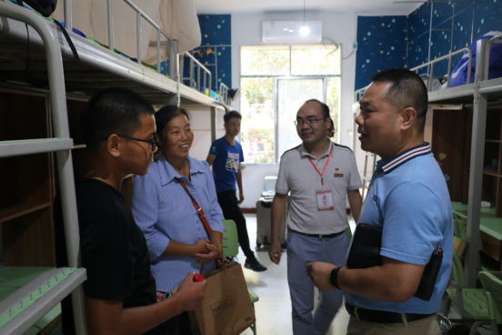 邓继勇一行人首先来到学海10栋,在宿舍中遇到了一位新生家长,邓继勇认真地询问了新生和家长对寝室的看法和建议,又跟新生分享了自己上大学时的宿舍生活,这不禁让同学们感到格外的亲切,原来的拘束一下子就减去不少,新生们也开始分享自己新入学的感受。在交谈中,邓继勇认真解答了关于宿舍管理制度,奖助学金评定等方面的制度。他表示员工如有困难,公司一定会提供帮助。在离开宿舍时邓继勇也对新生们提了几点要求:第一,在大学求学一定要有目标,不能荒废自我;第二,要努力学习,不能在自由的环境下松懈;第三,要常和父母交流,出门在外不能让家人担心。