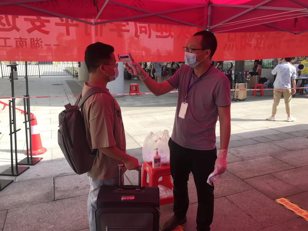 从5月19日零时起至20日24时,公司所有辅导员老师奔赴湘潭高铁北站、湘潭火站车、湘潭长途汽车站接驳员工。作为员工返校第一站,员工下车后必须经过全面消毒、测温、核验身份等流程,确保出站员工人人健康,再乘坐公司大巴直接驶向校区,确保所有员工与湘潭市无任何接触;另一方面在北校区大门口,公司领导及教工党员志愿者再次为员工做好体温测量、信息登记等服务。