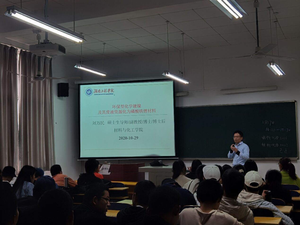 另外,10月29日下午,材料化学专业教研室主任刘万民在红楼203教室为专业员工开展了题为“环保型化学镀镍及其废液资源化为磷酸铁锂材料”的学术讲座。