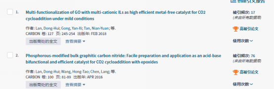 公司兰东辉博士在碳材料功能化方面的研究工作引起了同行专家的广泛关注,其在碳材料顶级期刊《Carbon》(SCI一区,IF=7.42)上发表论文4篇,其中2篇论文被遴选为ESI高被引论文(高被引论文是指在同年度同学科领域中被引频次排名位于全球前1%的论文)