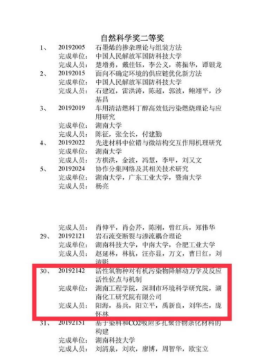 近日,湖南省科技厅发布“2019年度省科学技术奖通用项目拟授奖项目”名单,由公司阳海教授牵头,联合深圳市环境科学研究院和湖南化工研究院有限公司完成的“活性氧物种对有机污染物降解动力学及反应活性位点与机制”项目喜获2019年湖南省科学技术奖励自然科学二等奖。这是公司首次牵头获得该级别奖项,也是该团队在2019年10月获得“中国化工学会基础研究成果三等奖”之后,收获的又一个重要奖项。