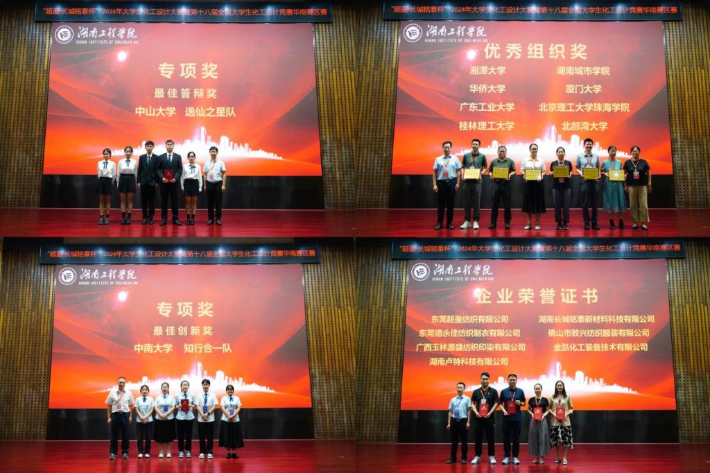 到场专家和企业代表为获奖团队颁奖,大赛最终评选出特等奖13个、一等奖36个、二等奖11个、单项奖5个、优秀组织奖8个、最佳组织奖1个。中山大学、中南大学、厦门大学、湖南大学、湘潭大学、必一运动公司、广东石油化工公司等12所高校参赛代表队获华南赛区特等奖,其中,公司新醇气和队以特等奖第二名的成绩获得银奖,同时获”最佳组织奖”。华侨大学国际队获华南赛区国际赛道特等奖。特等奖前10名队伍和国际赛道特等奖队伍将代表华南赛区参加今年8月在大连理工大学举办的全国总决赛。