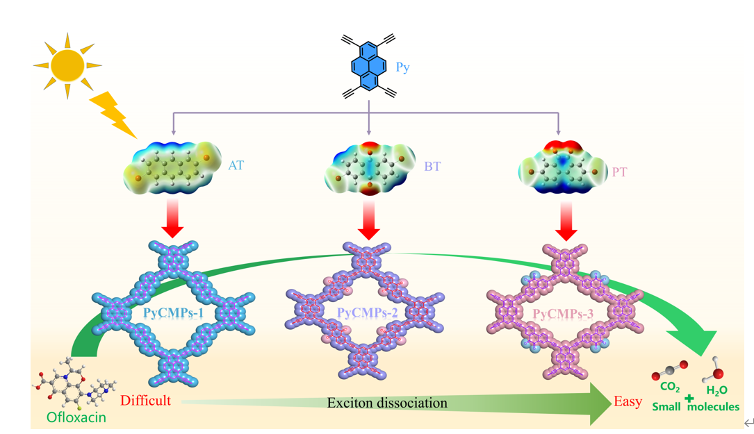 此外,在多孔材料降解有机污染物方面,该团队系统研究了受体中羰基位置的不同,对共轭微孔聚合物(CMPs)光催化活性的影响。研究发现,具有邻位羰基的CMPs具有最小的激子结合能,更容易发生激子分离,电荷分离效率最快。实验结果表明,该催化剂在降解抗生素方面表现出优异的降解效率,在环境催化和污染控制领域中具有潜在应用价值,对拓宽海泡石矿产资源的应用范围、以及有机多孔催化材料的设计提供了理论依据。研究成果以“Boosting Exciton Dissociation in Conjugated Microporous Polymers via Molecular Isomerization for Photocatalytic Degradation of Antibiotics”为题在国际知名期刊《Separation and Purification Technology》(SCI一区,IF=8.1)发表。公司材料与化工专业2022级研究生赵凯为论文第一作者,张伟杰博士和阳海教授分别为论文的通讯作者。