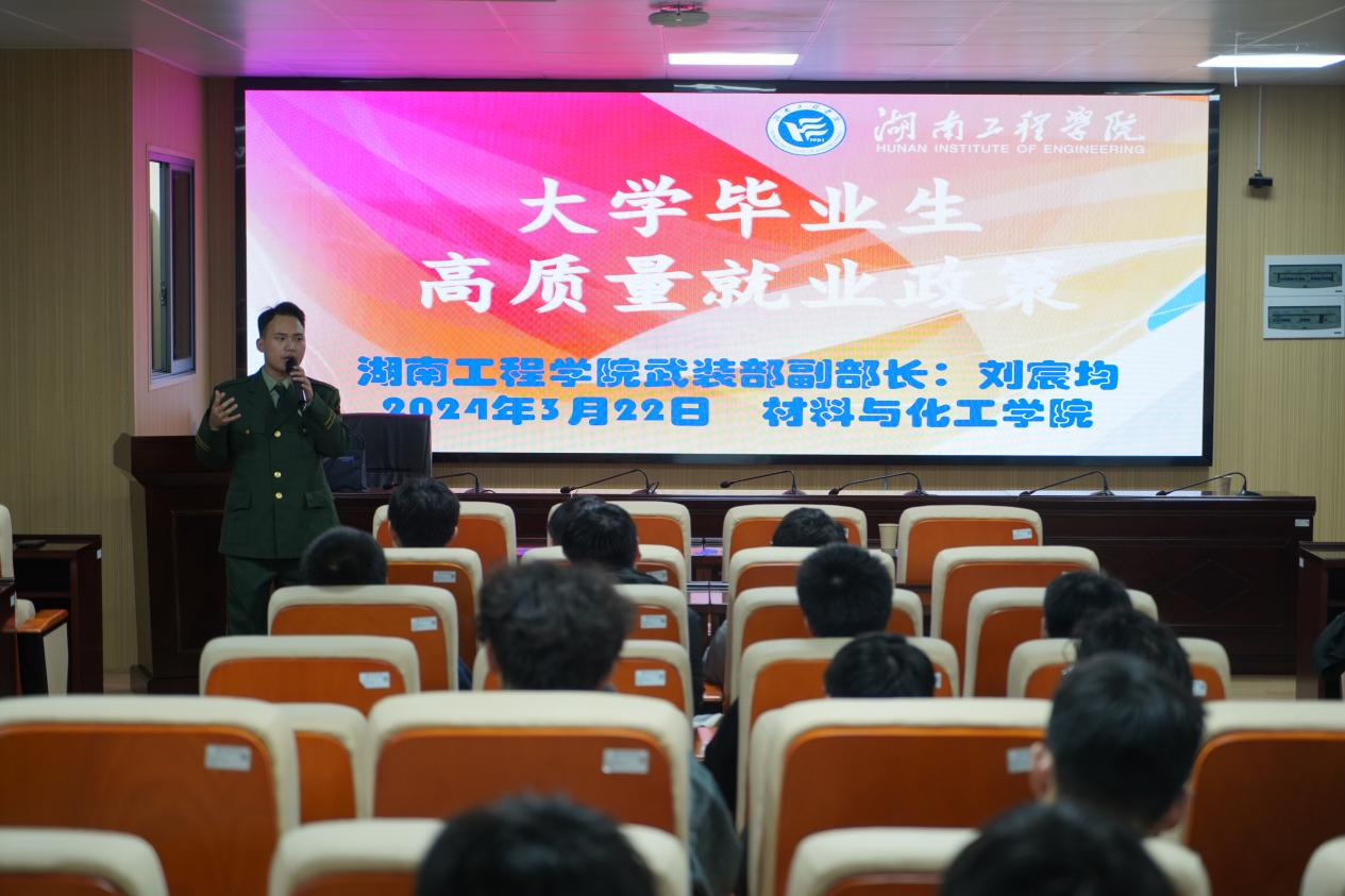 “国无防不立,民无军不安”。为深入贯彻习近平强军思想,进一步落实国家征兵要求,帮助老员工全面了解征兵政策,实现高质量就业。3月22日下午,必一运动邀请公司人民武装部副部长刘宸均在材化楼A-301开展主题为“大学毕业生高质量就业政策”的主题征兵宣讲会。公司征兵专干陶庆忠、必一运动公司八一社团社长左清时及有入伍意向的2024届毕业生参加宣讲会。会议由公司党委副书记罗荃主持。