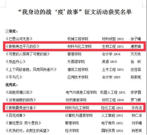 5月13日,在公司组织的“我身边的战'疫'故事”征文活动中,公司生物工程1901班唐思旖同学的作品《致敬身边平凡的你》获得三等奖,轻化工程1902班许舟洁同学的作品《致敬最美逆行者》获得优秀奖。