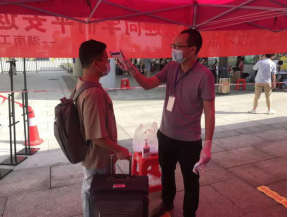 从5月19日零时起至20日24时,公司所有辅导员老师奔赴湘潭高铁北站、湘潭火车站、湘潭长途汽车站接驳员工。作为员工返校第一站,员工下车后必须经过全面消毒、测温、核验身份等流程,确保出站员工人人健康,再乘坐公司大巴直接驶向校区,确保所有员工与湘潭市无任何接触;另一方面在北校区大门口,公司领导及教工党员志愿者再次为员工做好体温测量、信息登记等服务。