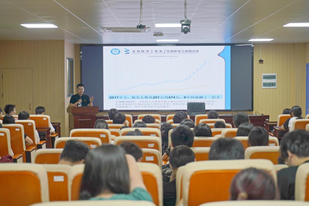 针对考研策略,唐桥结合历年考研形势,强调了基础理论学习的重要性,并分享了一套高效备考“英语+高数”的方法。对于同学们普遍关心的研究生就业问题,唐老师借助生动的案例,列举了生物化学专业人才在科研机构、制药企业、环保监测、食品安全等多个重要领域具有广阔的就业前景。