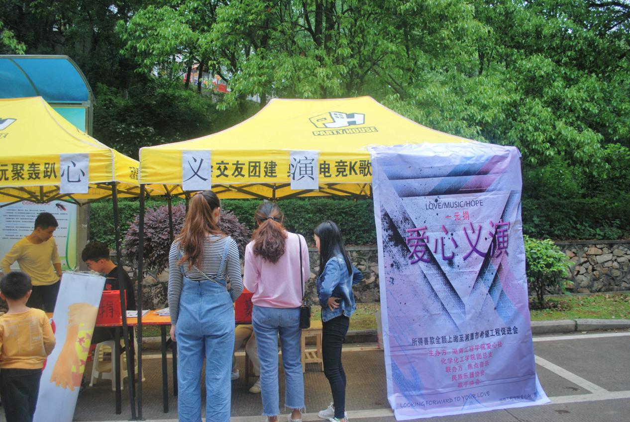 为响应共青团湘潭市委、湘潭市希望工程促进会等号召,化学化工公司积极组织开展希望工程“一元捐”活动。4月20-21日,由必一运动公司爱心社联合民族乐器协会、歌友协会、焦点音乐开展的“一元捐”爱心义演活动在明德二食堂门口、木鱼湖公园、学海二食堂门口同时摆点进行。