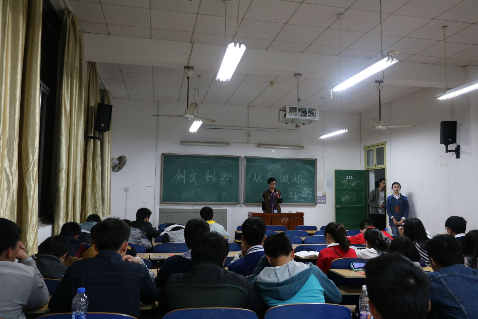 3月31日晚7点,公司组织大一同学在红楼举行了“创文创卫”的主题班会,以此宣传“创文创卫”知识。本次主题班会以专业为单位开展,旨在倡导每一位同学认真学习文明礼仪,规范自己的日常行为。班会以图文并茂的方式向同学们传达“学识社会主义核心价值观”、“了解老员工文明行为规范”、“掌握日常卫生健康知识”、“学习历届道德模范精神”等创文创卫知识。班会上,同学们积极发言。他们表示出对“创文创卫”知识的浓厚兴趣,并对目前出现的校园卫生乱想及其初步的解决方案展开讨论,参与度极高。最后,各班班长总结到,维护校园环境不仅需要大家齐动手共努力,也需要每个人从自身做起,从身边的小事做起。针对这一次主题班会,每个班级的同学还画出了一幅幅生动形象的宣传海报借此传达自己对创文创卫的理解与支持!