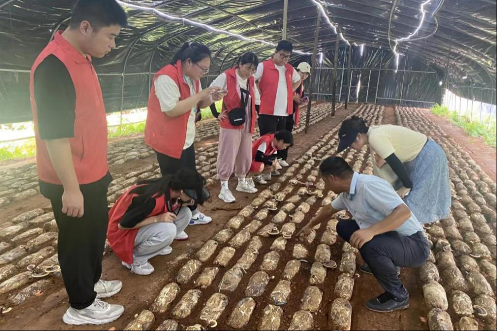 (图为志愿者们参观蘑菇种植基地)