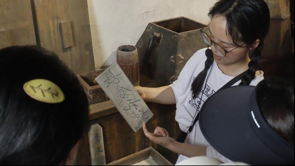 (图为讲解员为志愿者解说米行工具)