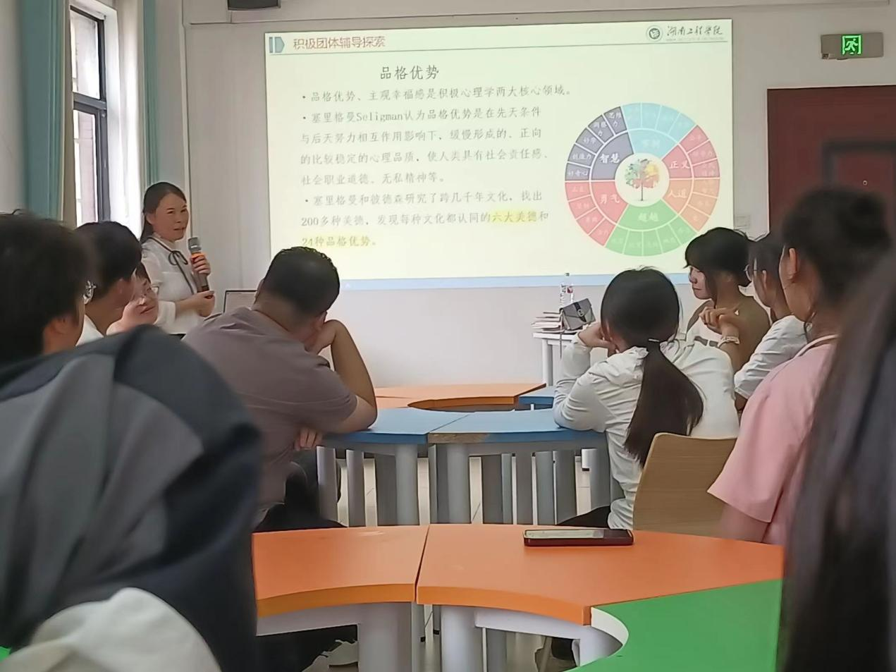 自我介绍环节后,黄玉娟带领同学们开始了趣味小游戏的热身环节,同学们很快就融入进来。此后,黄玉娟给大家介绍了品格优势,然后开展滚雪球游戏让大家进一步互相了解,并在小组之间设置队名并想好口号,提高同学们的团队协作。