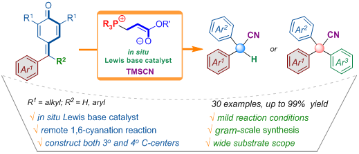 有机膦作为亲核催化剂在有机催化领域占据重要位置,但因其活化模式局限,该类催化剂催化的反应类型十分有限。近年来,有研究报道有机膦可以与丙烯酸酯原位形成有机碱催化剂,但是现有的报道多为布朗斯特碱催化剂,而其作为路易斯碱催化剂的报道寥寥无几。本研究首次将原位季鏻盐作为一种新型的路易斯碱催化剂应用于远程的1,6-氰基化反应,为二芳基和三芳基氰基化合物的合成开辟了新的绿色高效合成方法。