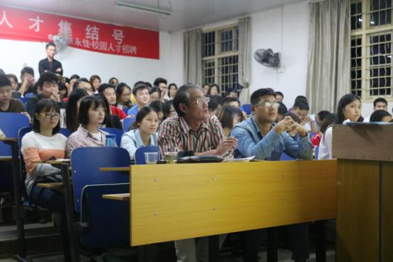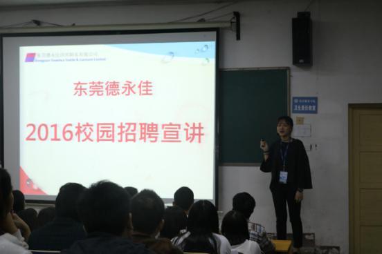 10月10日晚19点,广东省东莞市德永佳纺织制衣有限公司在公司电教101举办招聘会。参与此次招聘会的有化学化工公司党总支副书记张建国、该公司主要负责人以及应届大四毕业生,此次招聘主要面向纺织与轻化专业的员工。