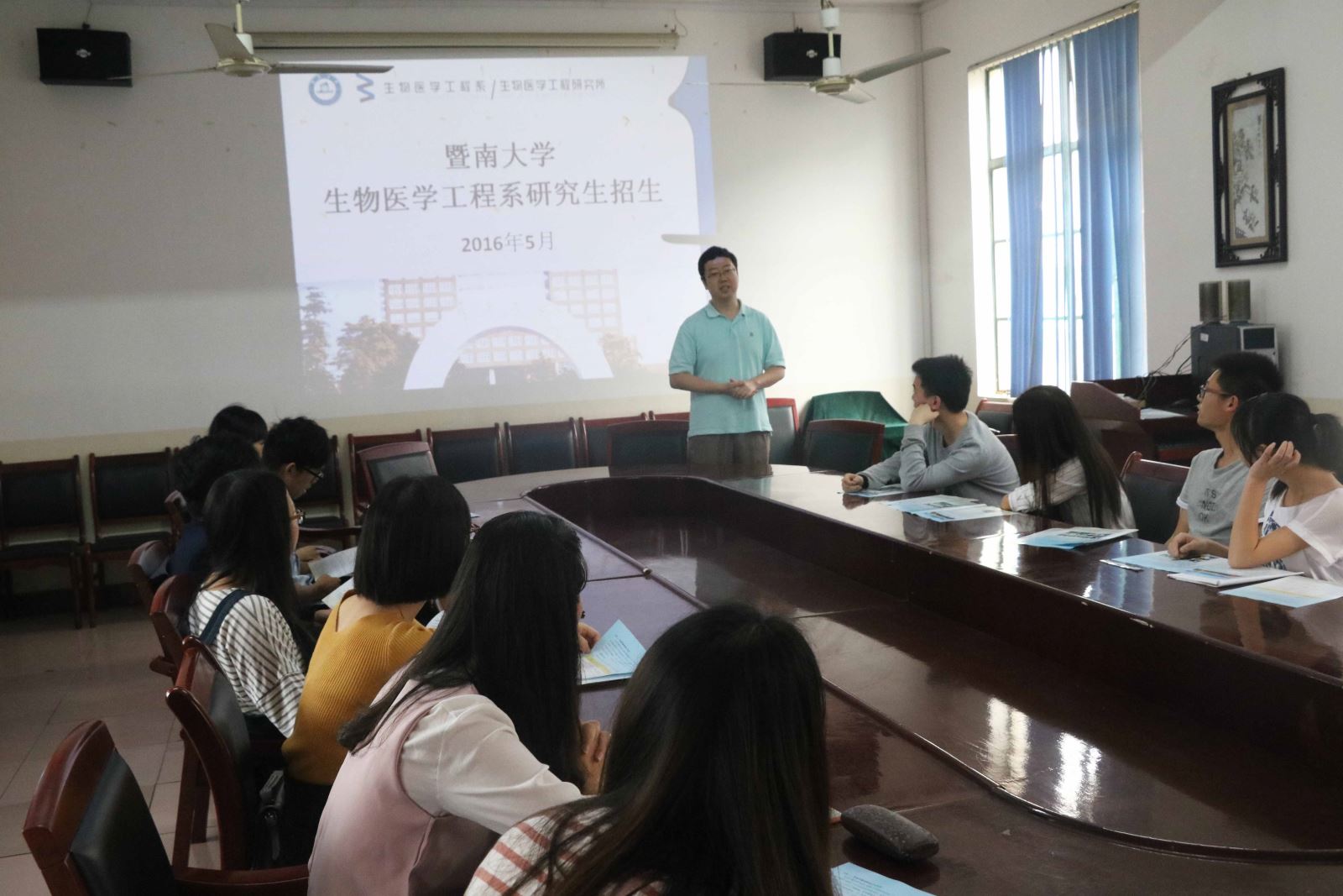宣讲会分为考研形式分析及现场答疑两个环节。宣讲会中,马栋结合ppt向同学们介绍暨南老员工物医学工程学科概况。他从公司地理位置、教学投入及对外办学理念三个方面出发,表明了暨南大学拥有强大的科研办学条件,是考研学子的不二选择。紧接着,他着重从生物医学工程学科的团队力量、科研条件及奖助学金三方面表明公司的的“硬件”优势,强调生物医学工程学科是“211工程”建设重点学科方向,先后投入近3000万经费,仪器设备齐全,拥有一整套严谨、科学的科研治学程序。