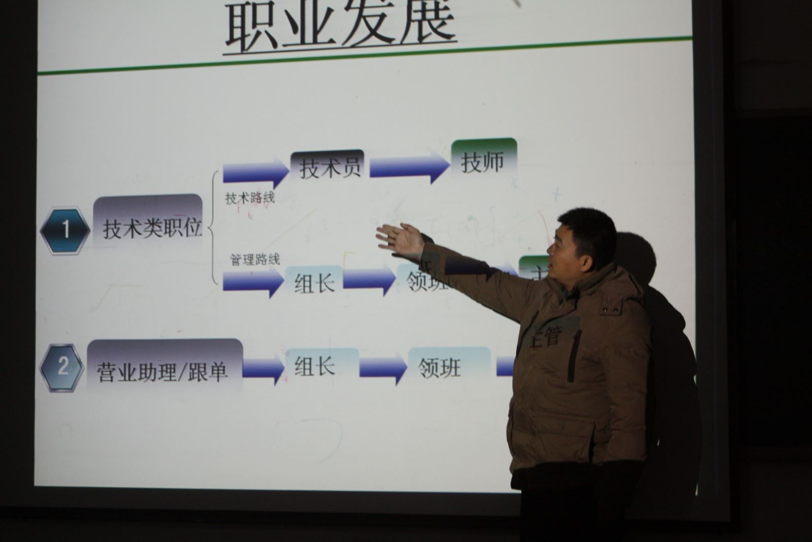 招聘会开始,柴永朋以ppt的形式向同学们展示了公司的选址、众多认证及核心价值观。其中,他对公司品牌至上、家庭第一、团队精神、创新求变的核心价值观进行了具体阐述。其后,为加深同学们对公司的了解,柴永朋通过一个视频介绍了公司的发展状况、公司的人才培训及员工丰富的娱乐生活,引起同学们较大的兴趣。他还结合自己的工作经验,提醒同学们找第一份工作时不应太在乎薪酬,只要能从中获得工作经验,了解工作框架,对以后的人生来说无疑收获巨大。