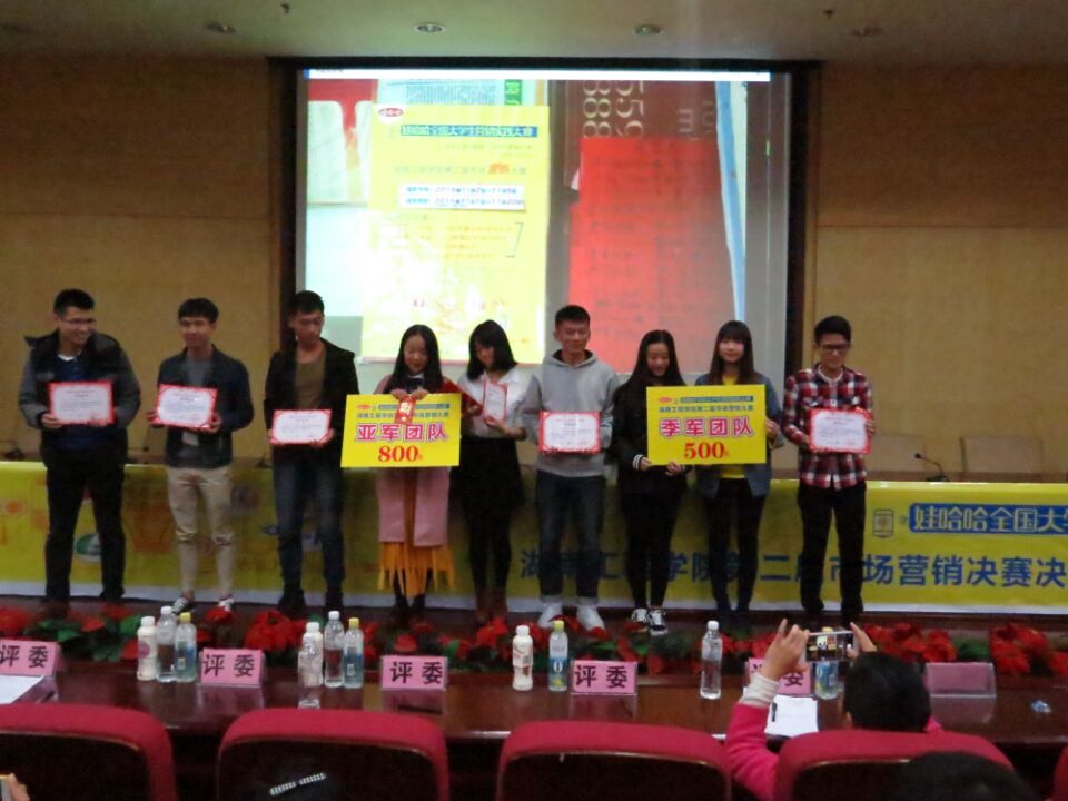 2016年11月17日晚7点,由必一运动公司化学化工公司和外国语公司联合主办的娃哈哈市场营销大赛决赛暨颁奖典礼在图书馆二报告厅举行。参与本次颁奖典礼的评委有化学化工公司学办主任吴菲、外国语公司团总支书记张婷、娃哈哈公司湘潭站负责人蒋海清以及化学化工公司与外国语公司的部分员工干部,本次比赛颁奖典礼由化学化工公司高分子1601班的李弼珺同学主持。