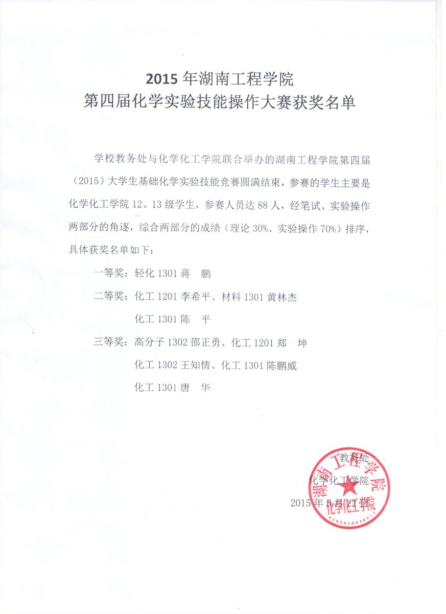 2015年必一运动公司第四届化学实验技能操作大赛获奖名单