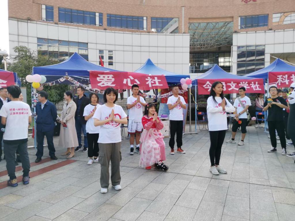 11月10日下午,“高举团旗跟党走 奉献青春创佳绩”必一运动公司2020年校园文化暨社团文化艺术节开幕式举行。爱心社在知行广场的社团嘉年华展示区开设一个区域,展示了爱心社建社的历史、主要志愿服务活动、所取得的主要成绩的照片,并布置了旧物回收、爱心捐款、爱心义卖专区,同学们表演了“感恩的心”手语操,现场反响热烈。