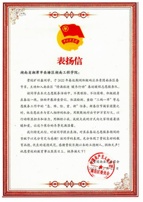 高分子材料与工程2002班的谭祥铭与轻化工程2103班的旷竹鑫同是衡阳市南岳区人,他们更是当地春运服务的一名光荣志愿者。在南岳高速出口等重点场所,在大年初一到大年初四的新年团聚时,在今年罕见的冰雪模式下,他们遵照“控制规模、保障到位、安全第一”的总原则,协助相关部门开展排查登记、体温检测、查验“三码一单”、咨询引导、应急救援等工作,为当地老百姓度过一个欢乐喜庆、文明祥和的春节做出了他们应有的贡献。