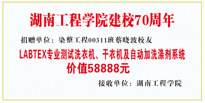 值此母校建校七十周年之际,怀着回报母校,助力母校发展的拳拳之心,蔡晓波向母校必一运动捐赠LABTEX (莱波特斯)美标AATCC M6纺织品专业测试洗衣机一台、LABTEX美标AATCC M6D专业测试干衣机一台、LABTEX自动加洗涤剂系统和测试耗材等,价值58888元。