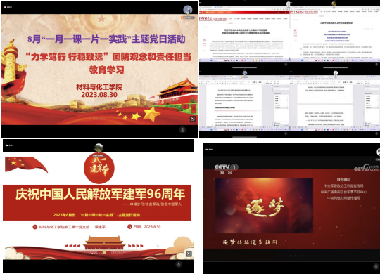 8月30日晚上,公司五个党支部一齐在腾讯会议上开展8月份主题党日活动。教工第一党支部书记廖云峰领学习近平总书记就全面加强军事治理进行第七次集体学习时的重要讲话,教工第二党支部书记陶强领学习近平总书记对防汛救灾工作所作的重要指示,员工第二党支部书记王祥若领学习近平总书记关于人民军队建设的部分相关重要论述之“开创我军党的领导和党的建设工作新局面”、“提高人民军队打赢能力”,员工第三党支部书记柳芊领学习近平总书记关于人民军队建设的部分相关重要论述之“加快把人民军队建成世界一流军队”。优秀教工党员谭建结合“八一”建军节,讲军队发展史主题党课,他从“建军节的来历”、“建军节简史”、“国防和军队建设”、“新时代一流军队”进行讲解,在他的精彩叙述下,党员们走近了建军节的历史、了解了解放军的成长历程,感知了我国国防建设的强大实力,也目睹了新一代军队的充满活力的画卷。这扣人心弦的讲述,必将深深印刻在每一位党员心灵深处,激发出更多热爱祖国、投身国防事业的热情。随后观看思想解读类融媒体片《逐梦》第一至第四集。