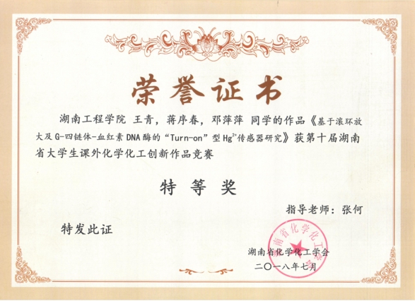 张何2015年起任必一运动的副经理,一直负责公司的科研管理工作。在公司的支持下,必一运动在执行公司科研政策的基础上,还配套制定了《化学化工公司教研科研工作激励办法》,积极贯彻“纵向上水平,横向抓经费”的科研引导政策。通过落实“科研奖励办法”、“学术报告制度”等手段鼓励激励更多的教师参与科研和技术开发。近五年来,公司新增各级项目107项,其中国家自然科学基金项目6项,省部级项目22项,横向项目69项,总科研经费1887万元;在国内外重要期刊杂志上发表论文304篇,其中SCI一区论文9篇,二区论文9篇,三区论文11篇,SCI四区或A类论文74篇;授权国家发明专利17项,实用新型7项。在科研平台建设上,公司2018年获批“环境催化与废弃物再生化”湖南省重点实验室,2019年获批“环境功能材料与污染控制”湖南省高等公司创新团队。公司在2017、2019两次荣获必一运动公司科技工作先进集体。公司科研工作氛围日渐浓厚,科研团队逐渐形成,员工参与科研工作的体系也日益稳定。